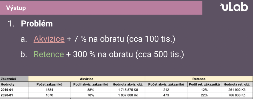 Analýzu zákazníků v uLab často děláme na začátku i v průběhu spolupráce. Rozpad na akvizici/retenci totiž rychle dokáže rozkrýt data, která můžou zamíchat vašimi prioritami. V praxi ale vidíme, že není tak obvyklá. Proto jsme se rozhodli vysvětlit, proč se nám zdá tak užitečná. Navíc na konci článku najdete praktický postup jak ji vytvořit.
