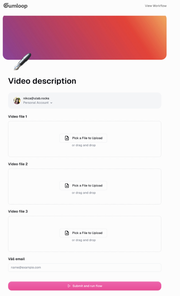 - Nejprve si připravíme interface: pole pro minimálně jedno video (odkaz nebo soubor) a e-mail, na který chceme zaslat výslednou analýzu.