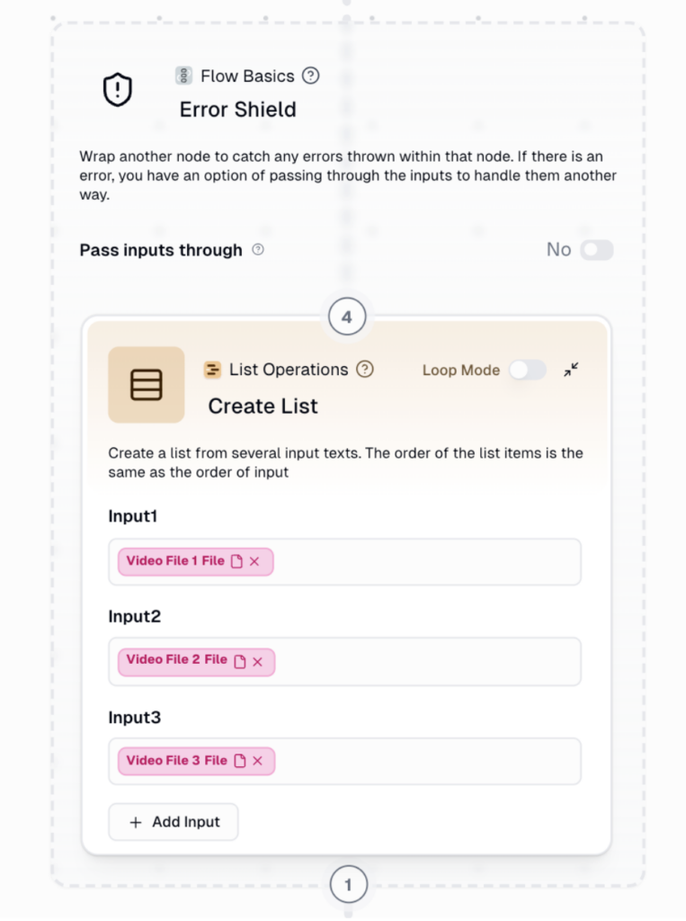 - Pomocí nodu „Create list“ sjednotíme videa do seznamu a opět přidáme „Error shield„, aby se workflow nezastavilo kvůli jednomu problematickému videu.