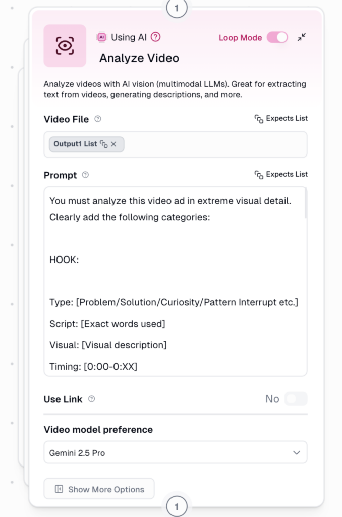 - Node „Analyze video“ popíše každou scénu zvlášť (co je v obraze, hook, titulky/voiceover, produkt, nabídka, CTA).