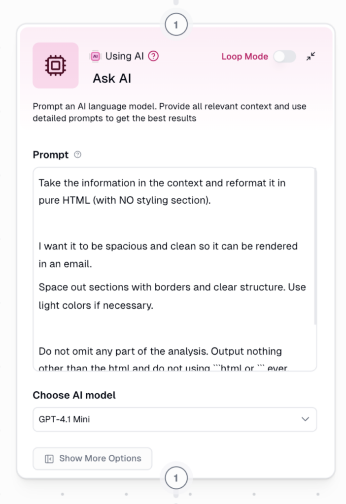 - V nodu „Ask AI“ si necháme výstup převést do přehledného formátu (např. HTML), aby šel snadno sdílet a používat.