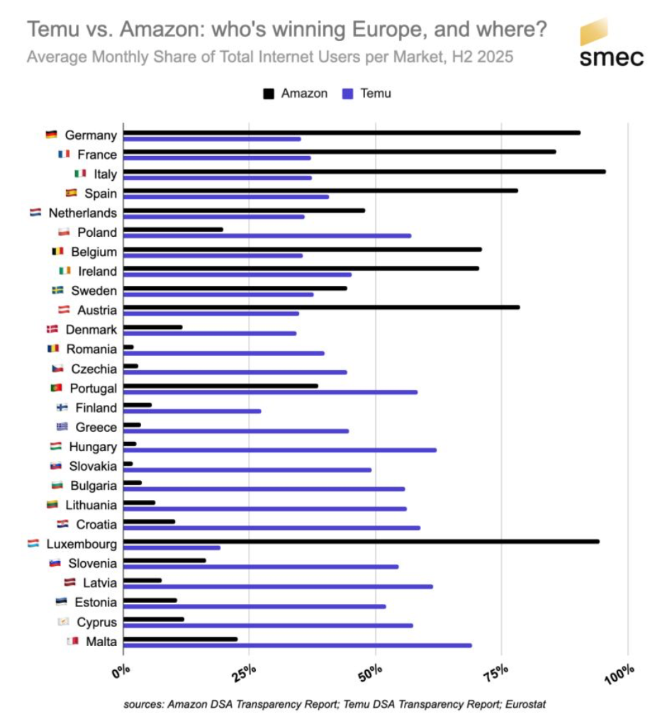 Ještě se podívejte na srovnání Amazon vs. Temu napříč EU, je vidět, že Amazon si podmanil bohatší státy a Temu spíš státy s nižším HDP. Nicméně ještě není tak silný jako Amazon.