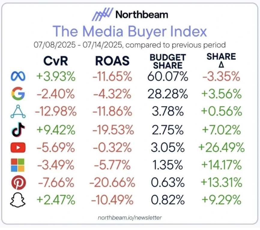 - Jak se vyvíjí placená média v US (analýza Tinuiti): investice do Google vyhledávání rostly o 11 % (díky více proklikům z shoppingu), 59 % spendu je na pMax kampaních. Co se týká Mety, tak reelska udělala 21 % reklamních zobrazení. TikTok spend klesl o 20 %.