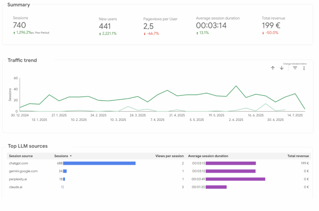 - Tady ještě můžete mrknout na dashboard, který vám zobrazí traffic z AI nástrojů. Co mi přijde v tomto přehledu super, že vidíte i vstupní stránky, které vás mohou navést, na co se lidi vlastně ptali.