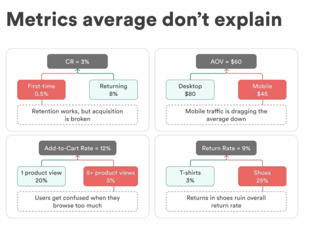- Toto si chcete zapamatovat: “Averages don’t explain. Segments do.” Tady je pár příkladů: