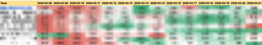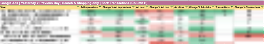 Řádky jsou jednotlivé účty. Ve sloupcích pak hodnota dané metriky „včera“ x % porovnání s předchlzím dnem (zda je porovnání % nebo absolutní nastavíte v Supermetrics.