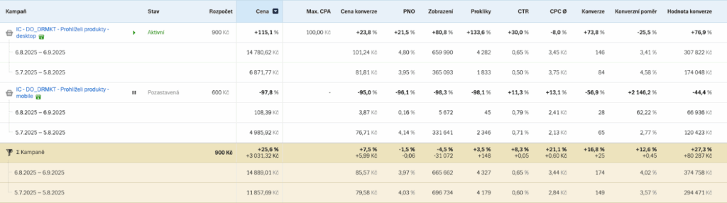 Výkon v Skliku: Strategie zafungovala podle očekávání. Podařilo se nám získat více konverzí – celkový počet konverzí vzrostl o +16,8 % a hodnota konverzí o +27,3 %.