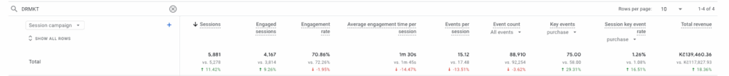 Pohled GA4: Pozitivní trend potvrdila i data z GA4. Obrat z DRMKT kampaní vzrostl o více než 18 %. PNO kampaně podle GA4 přitom zůstalo v podstatě stejné PNO (z původních 10,06 % na 10,67 %).