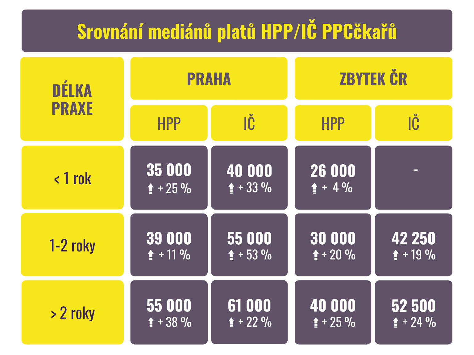 V Praze si junior na HPP aktuálně vydělá 35 tisíc a je to nárůst oproti roku 2018 o 25 %. Senioři si polepšili víc a plat jim vyrostl skoro o 40 % na 55 tisíc. Ve zbytku ČR jsou platy samozřejmě nižší a také rostly o něco pomaleji. Junioři si přijdou na 26 tisíc a plat se jim za posledních 5 let téměř nezměnil. Senioři vydělávají 40 tisíc a těší se z 25 % růstu.