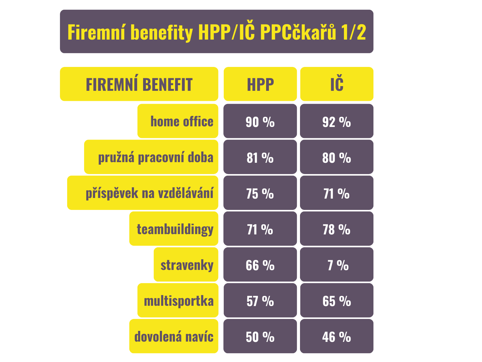 Nakonec jsme se ještě ptali na benefity, které mohou lidé využívat ve své práci. Nejhojnějším benefitem byl samozřejmě home office a pružná pracovní doba. Kolem 70 % PPC specialistů dostává příspěvek na vzdělání, stravenky a má firemní teambuildingy.