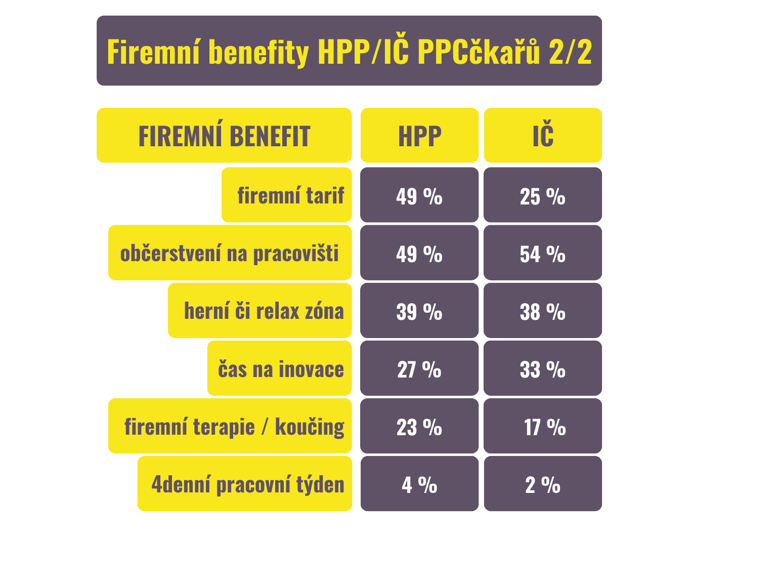 Kromě měsíčního platu PPC specialistů nás také zajímalo, v jakém pracovním vztahu se zaměstnavatelem PPCčkaři jsou (zaměstnavatel, zaměstnanec na HPP, zaměstnanec na IČ nebo freelancer), pro koho pracují (agentura, inhouse tým klienta, různí klienti na freelance), jejich subjektivně vnímaná pokročilost (junior, medior, senior) a délka praxe v oboru, v jakém městě pracují, a nakonec jaké využívají firemní benefity.