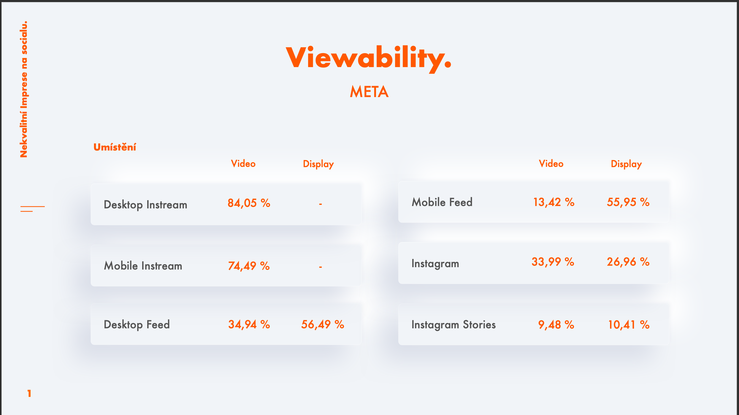 Marie Szénásiová z Dentsu nás provedla viewabilitou na sockách. V rámci měření svých kampaní zjistila, že se průměrná viditelnost na sítích zásadně liší. Na Meta jí vyšla viewabilita 38 %, na Tiktoku 10 % a na Pinterestu neuvěřitelných 93 %. Zvýšit viewabilitu můžete optimalizací cílovky, umístění, formátů a volbou kanálů. Celou prezentaci vám ale bohužel sdílet nemůžeme. Takto vypadala viewabilita napříč umístěními:
